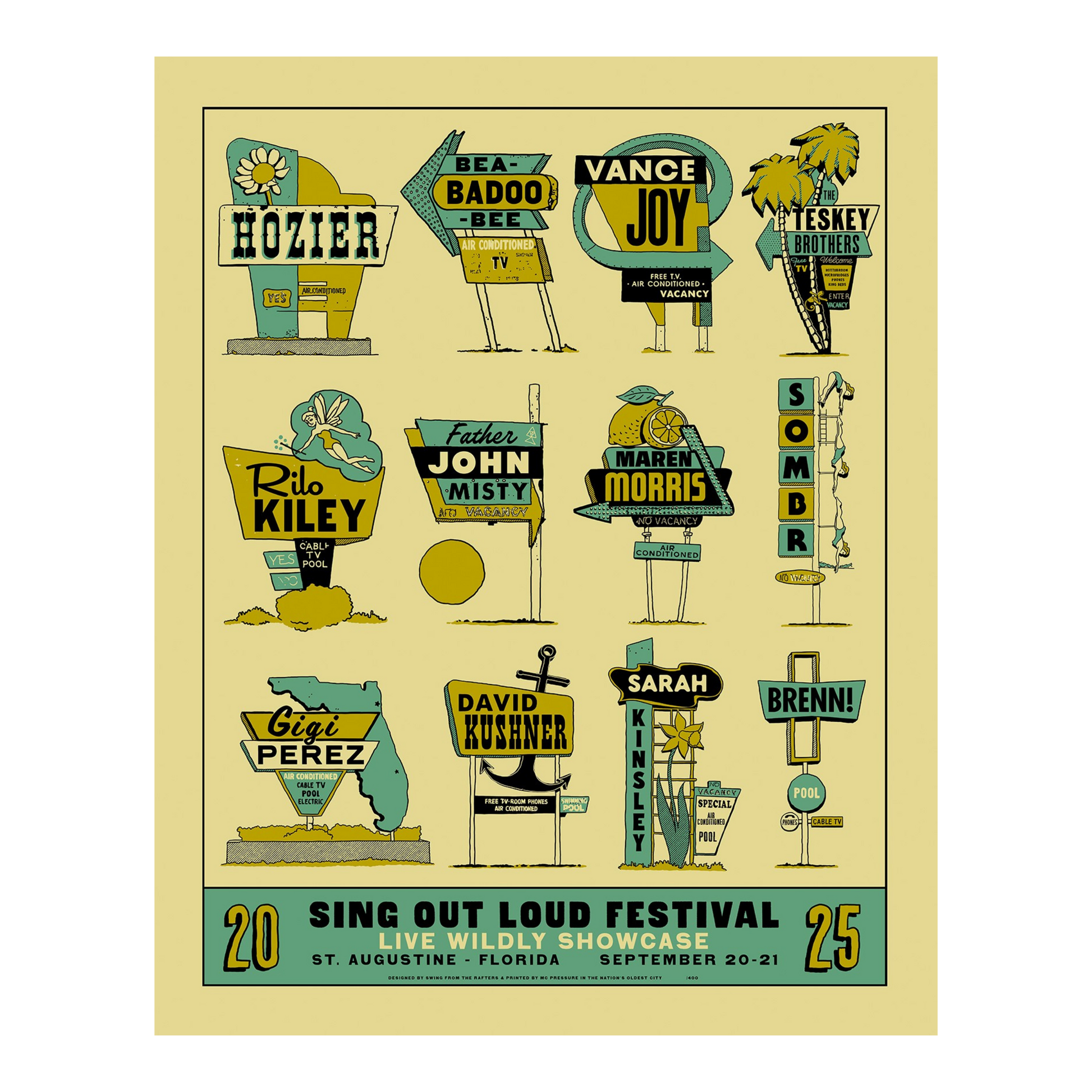 Snag the limited-edition Live Wildly Showcase 2025 letterpress poster, featuring this year’s full lineup of headliners. Each piece is hand-printed, giving every poster a one-of-a-kind finish with slight natural variations.